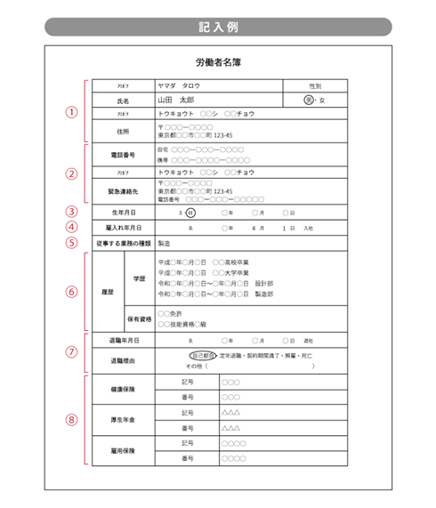 前項で紹介した項目を全て記載すると、このような労働者名簿が完成します。労働基準法の定めにのっとった内容となっているため、「具体的な書き方がよくわからない」とお悩みの人事・採用担当者はぜひ参考にしてください。
