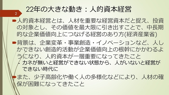 2022年の人事の動きを振り返ると、「人的資本経営」がビッグワードであったと言えるでしょう。人的資本経営とは、人材を重要な経営資本だと捉え、投資の対象とし、その価値を最大限に引き出すことで、中長期的な企業価値向上につなげる経営のあり方です。
