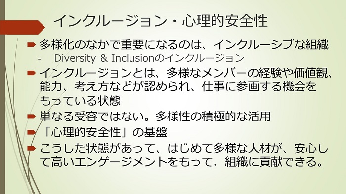 専門性がそれぞれ異なるなど多様化も進みますから、インクルージョンのある組織を目指すことも忘れてはなりません。ただし、インクルージョンは単なる受容ではありません。多様なメンバーの経験や価値観、能力、考え方などが認められ、仕事に参画する機会を持っている状態であり、このような状態が「心理的安全性」の基盤にもなります。