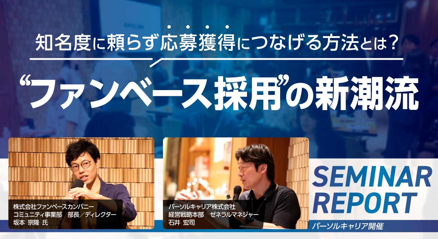 採用成功のキーワードは、共感を軸にした新しい採用戦略「ファンベース採用」です。本セミナーでは、パーソルキャリアの石井氏より、転職市場の変化についてお伝えした後に、株式会社ファンベースカンパニーの坂本宗隆氏より、ファンを基盤に事業価値を高める「ファンベース」の考え方や、応募者獲得につなげる具体的な方法などをお話いただきました。社員のリアルな声を活かし、認知度の壁を超えた採用を実現するヒントとしてください。