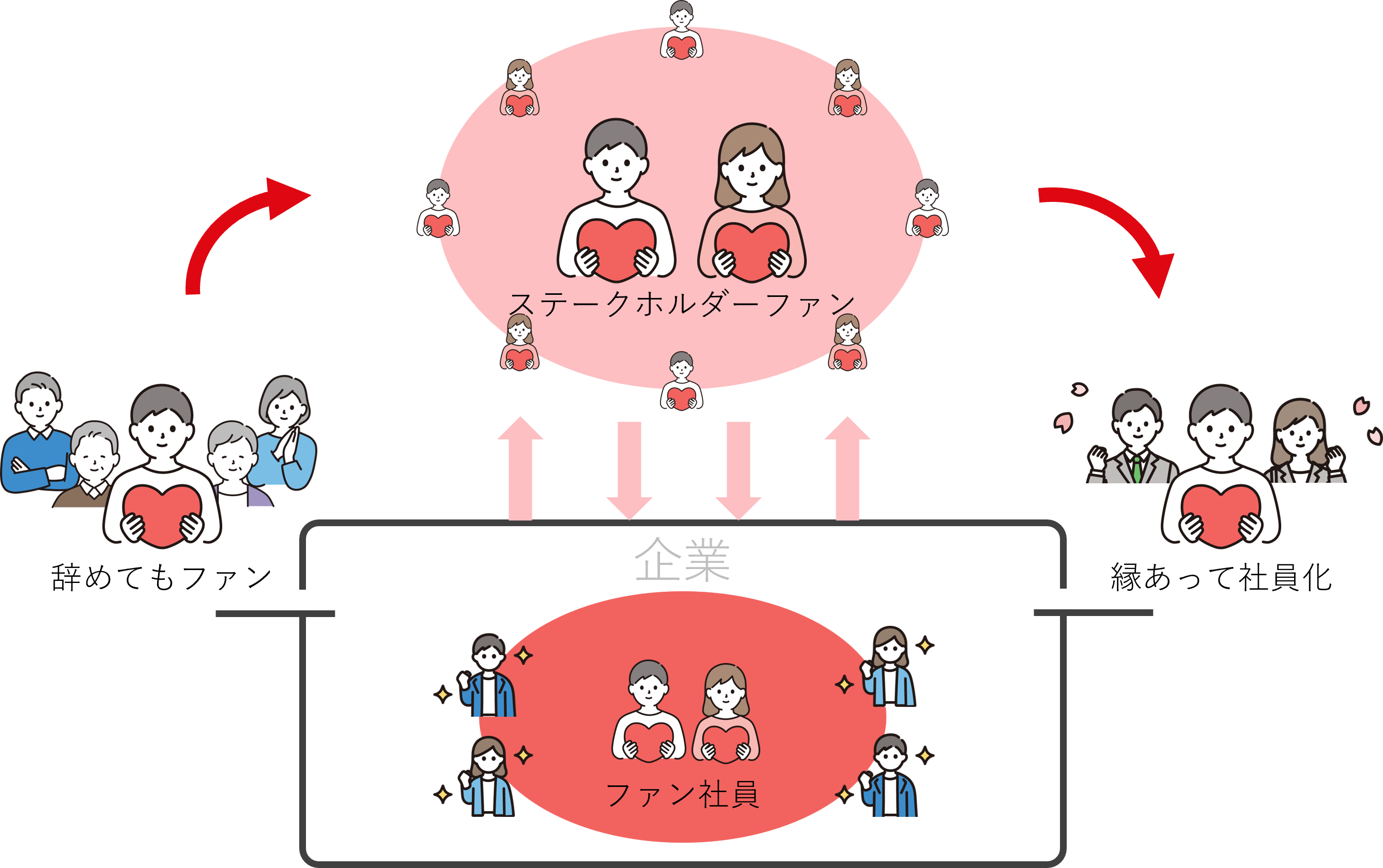 既存の社員が会社のファンとして働き続けていれば、会社の魅力は自然に伝播していきますし、事業にも好影響を与えます。ファンの対象は社員だけでなく、会社に関わるあらゆる人(ステークホルダーファン)、会社を卒業した人などもコミュニケーションの対象となります。