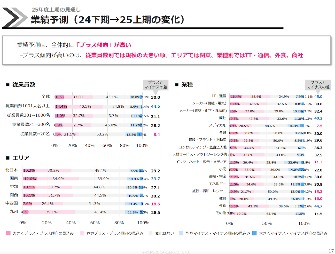 従業員規模、エリア、業種に分けて分析したところ、企業業績は全体で見るとプラス傾向が全ての区分で多く見られています。2月時点では引き続き業績が伸長傾向にあり、企業規模では大企業、エリアでは関東、業種別ではIT・通信、商社が特に伸びています。加えて、前回調査と比較すると「外食」の伸長傾向が大きく、インバウンド需要の高まりが影響しているのではないかと見ています。