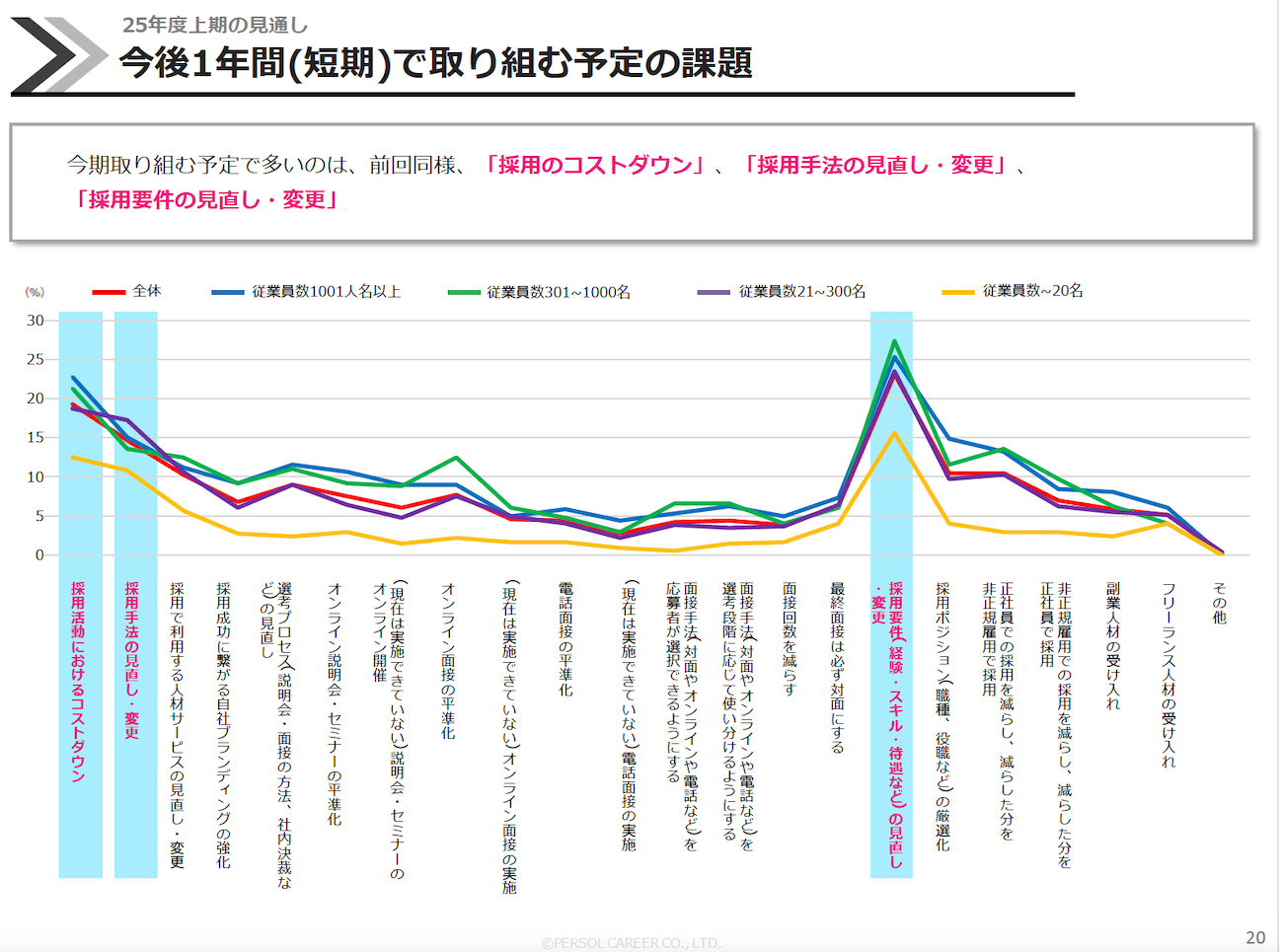 大企業は厳選採用にシフトし採用数は減少傾向。一方で20名未満の企業や中小企業では採用裾野が広がり、通年採用や新規採用チャネルの活用が進んでいる