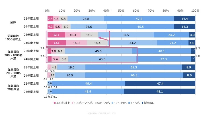 「2025年度 採用実績の推移(従業員規模ごとの直近の動き)」