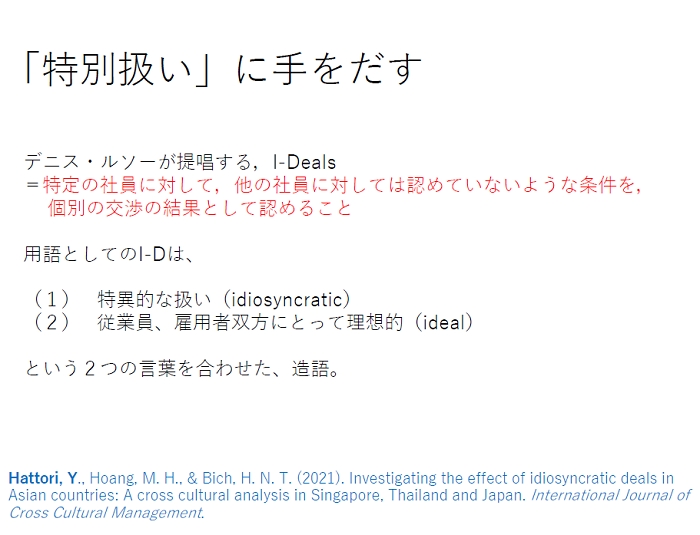 最後はアドバイスというよりも問題提起だと思ってください。私はアメリカに出向き、採用を行っている企業の状況を確認するフィールドワークを長年続けています。そのためアメリカの採用における流れをキャッチアップしており、その一つがこの「I-Deals」、私の研究テーマでもある「特別扱いに手を出す」です。