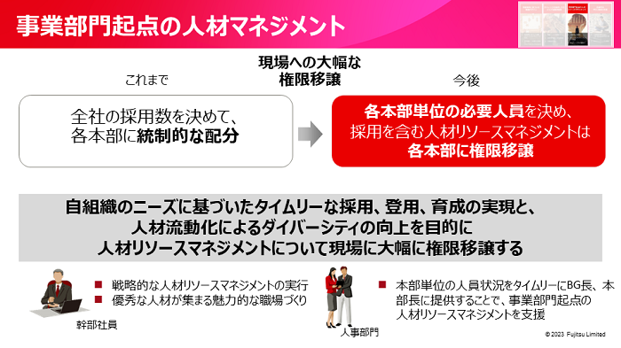 そこで全社の採用数を決定して、人事が各本部に統制的に採用枠を配分していた制度を廃止し、ビジネスサイドとアラインしながら、各本部単位で必要人員を決めることとし、採用を含む人材リソースマネジメントは各本部に権限移譲することにしました。