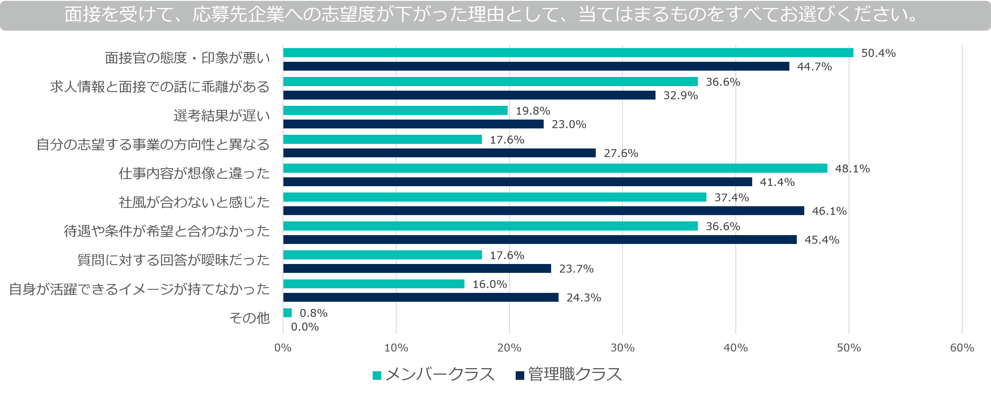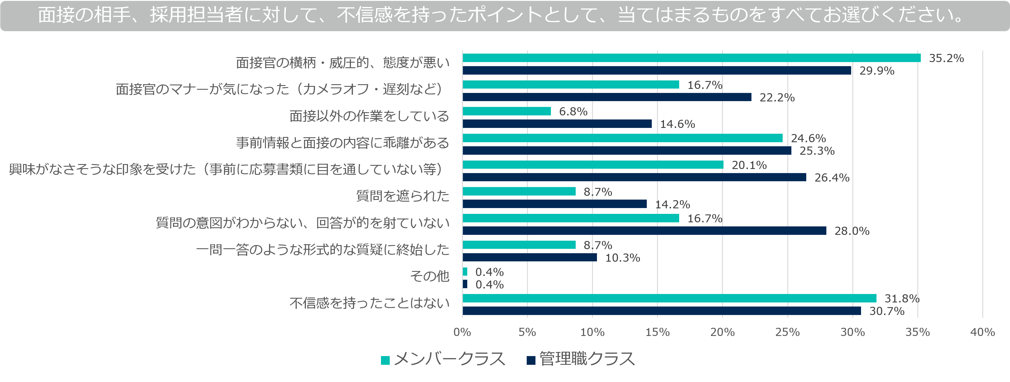 また、管理職クラスでは「面接官の横柄・威圧的、態度が悪い」(29.9%)のほか、メンバークラスと比較して「質問の意図がわからない、回答が的を射ていない」(28.0%)や「面接官のマナーが気になった」(22.2%)なども、多く挙がっています。