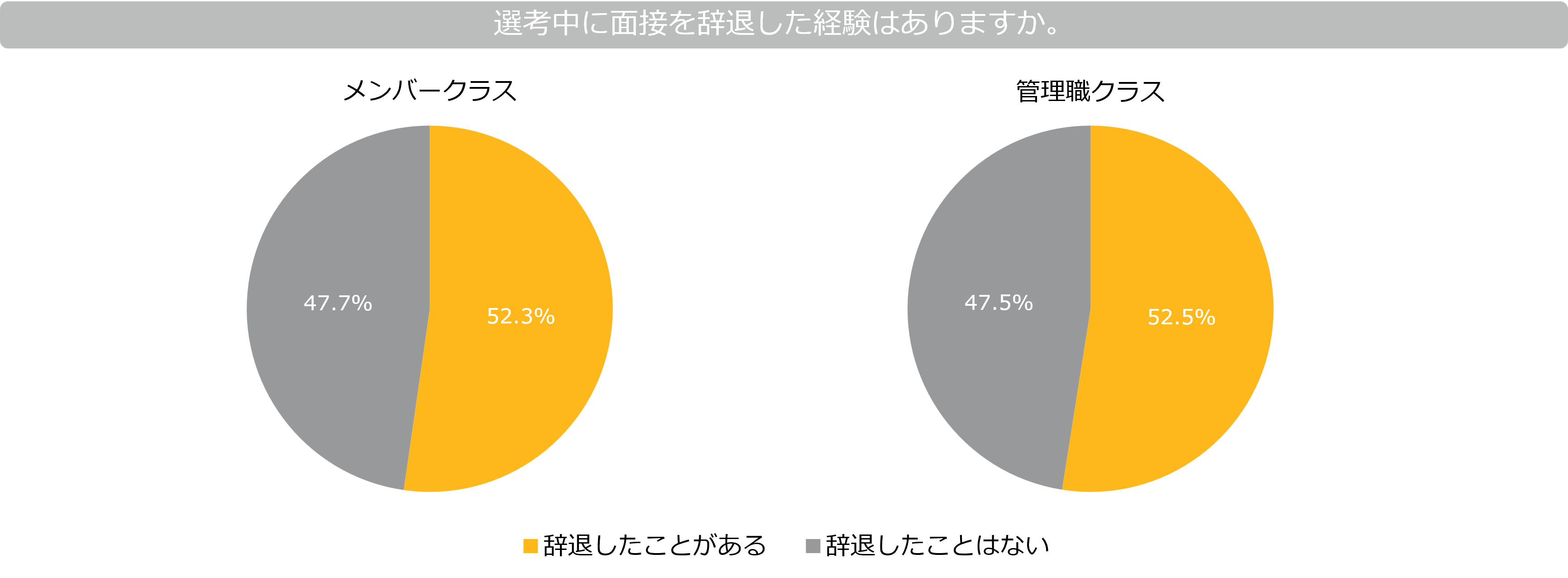 「選考中に面接を辞退した経験はありますか」と聞いたところ、メンバークラス(一般社員、係長)では、選考中に面接を「辞退したことがある」が52.3%、「辞退したことはない」が47.7%と辞退経験者がやや多い結果に。