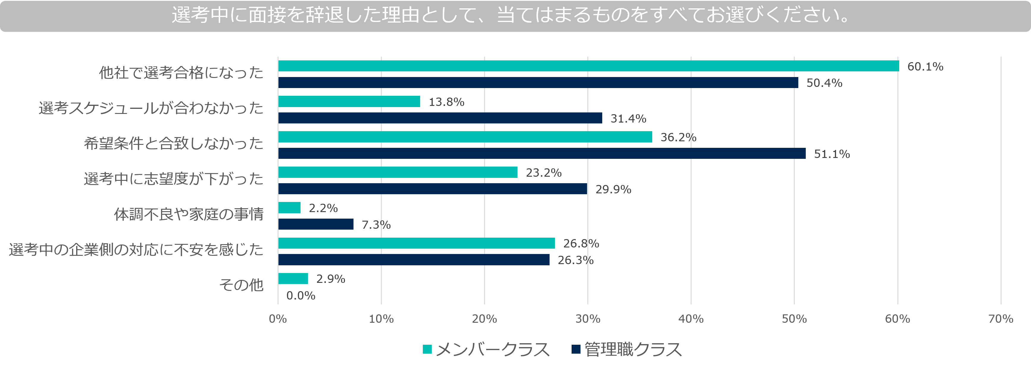 他には、「希望条件と合致しなかった」「選考スケジュールが合わなかった」では、メンバークラスに比べて管理職クラスでそれぞれ10ポイント以上多く票を集めており、役職別で差が出ています。