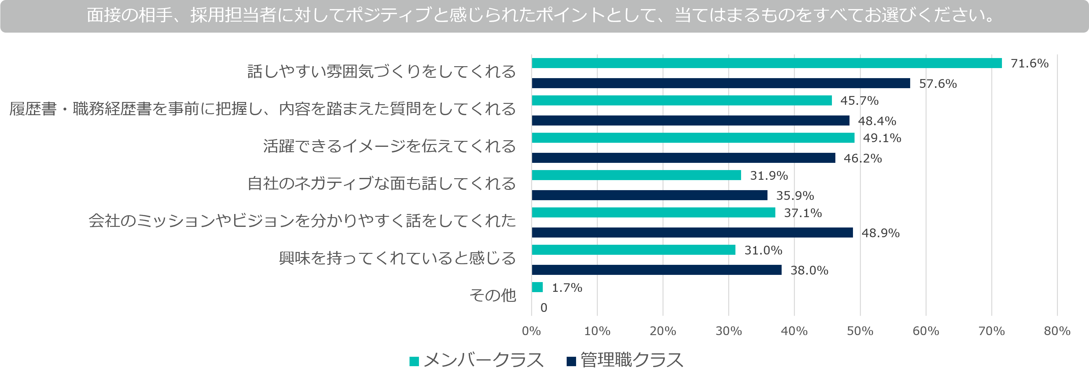 面接の相手、採用担当者に対してポジティブと感じられたポイントについて聞くと、両クラスとも「話しやすい雰囲気づくりをしてくれる」が(メンバークラス71.6%、管理職クラス57.6%)と最も高く、安心して話せる環境が重視されているようです。
