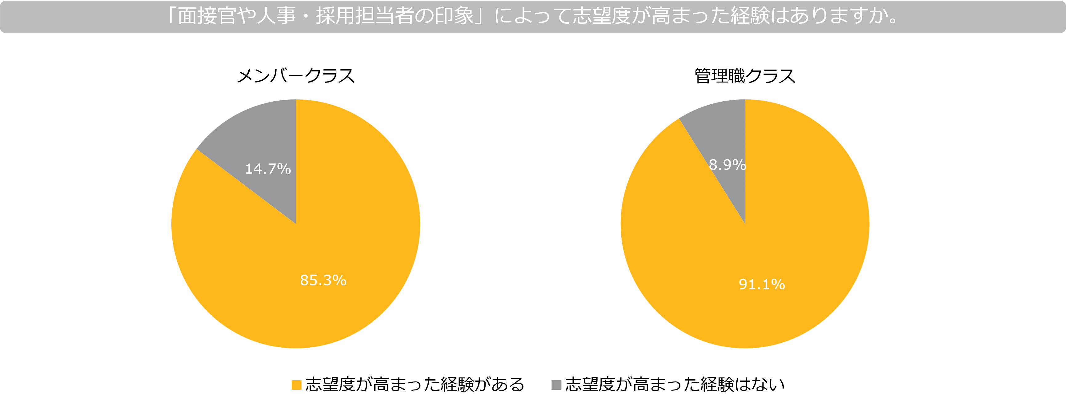 続いて、面接官や人事・採用担当者の印象によって志望度が高まった経験について聞くと、メンバークラスでは85.3%が「志望度が高まった経験がある」、14.7%が「志望度が高まった経験がない」と回答。管理職クラスでは、91.1%が「志望度が高まった経験がある」、8.9%が「志望度が高まった経験がない」と回答しました。