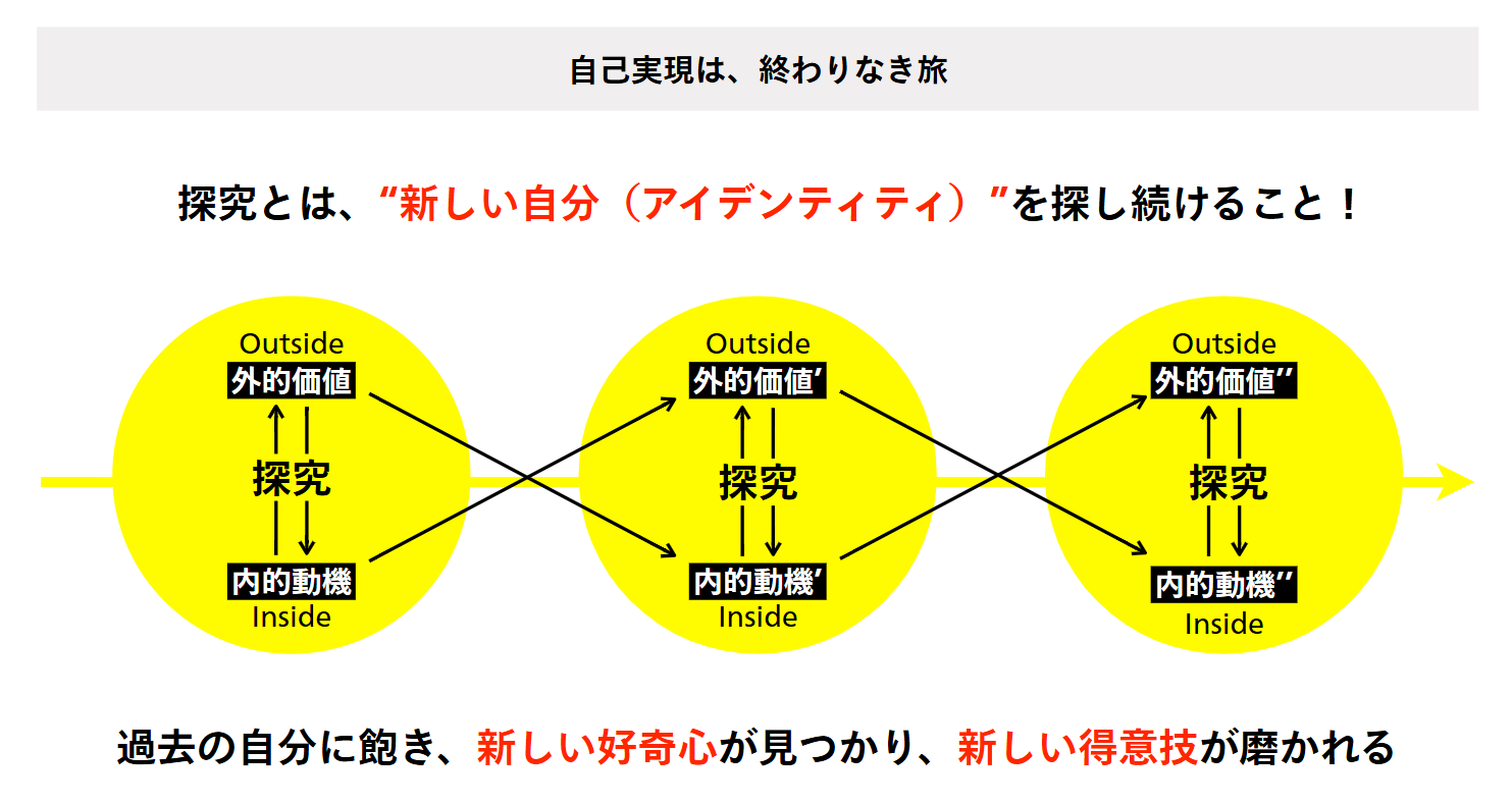 自己実現には終わりがありません。たとえ一度、内なる動機と外なる価値が重なったとしても、人はやがて飽き、環境も変わります。