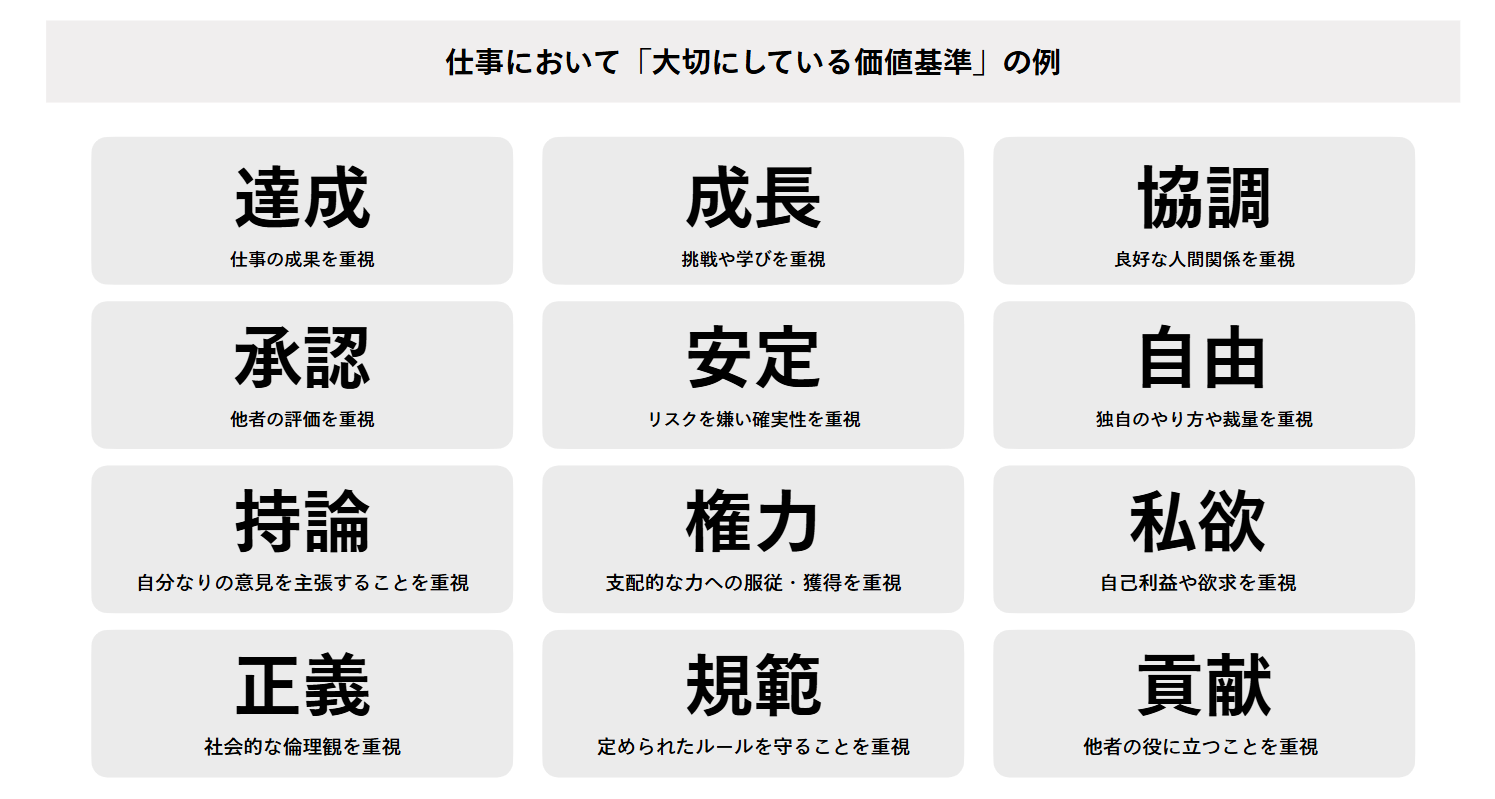 仕事において「大切にしている価値基準」にはさまざまなキーワードがあります。以下はその一例です。