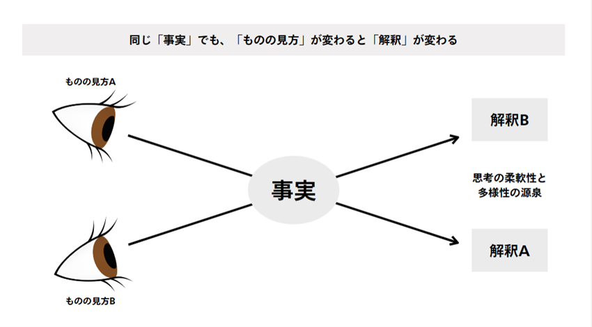 私たち人間は、同じ事実を目の前にしても、生まれや教育、興味によって解釈に違いが発生するものですが、ものの見方が固定化してしまうと、冒険的世界観を阻んでしまうのです。