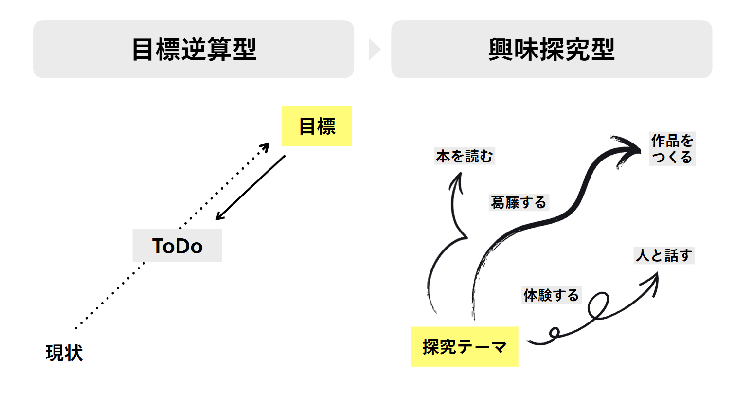 現在は「興味探究型」のアプローチに変わりつつあります。ここでは最初に「目標」ではなく「探究テーマ」を設定します。
