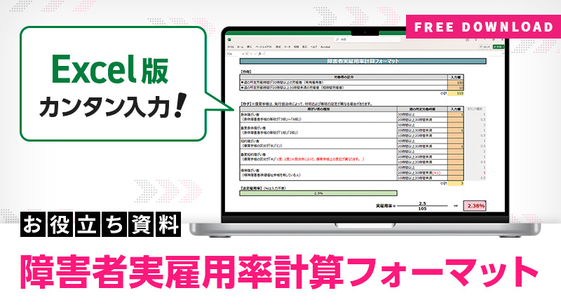 知っておきたい自社の障害者雇用率を試算できる計算シートです。今後、法定雇用率が変わっても活用できますので、ぜひお役立てください。